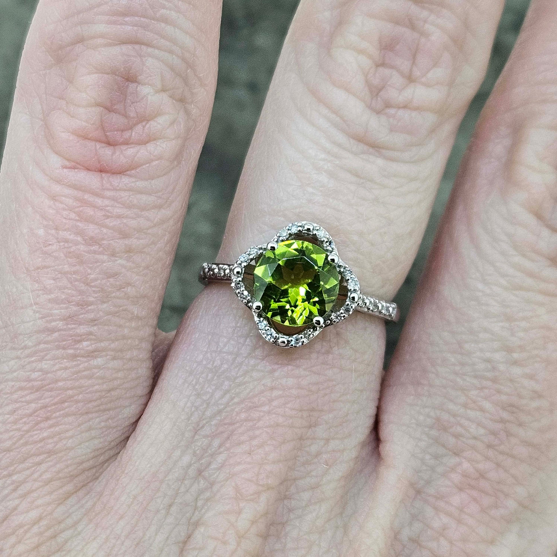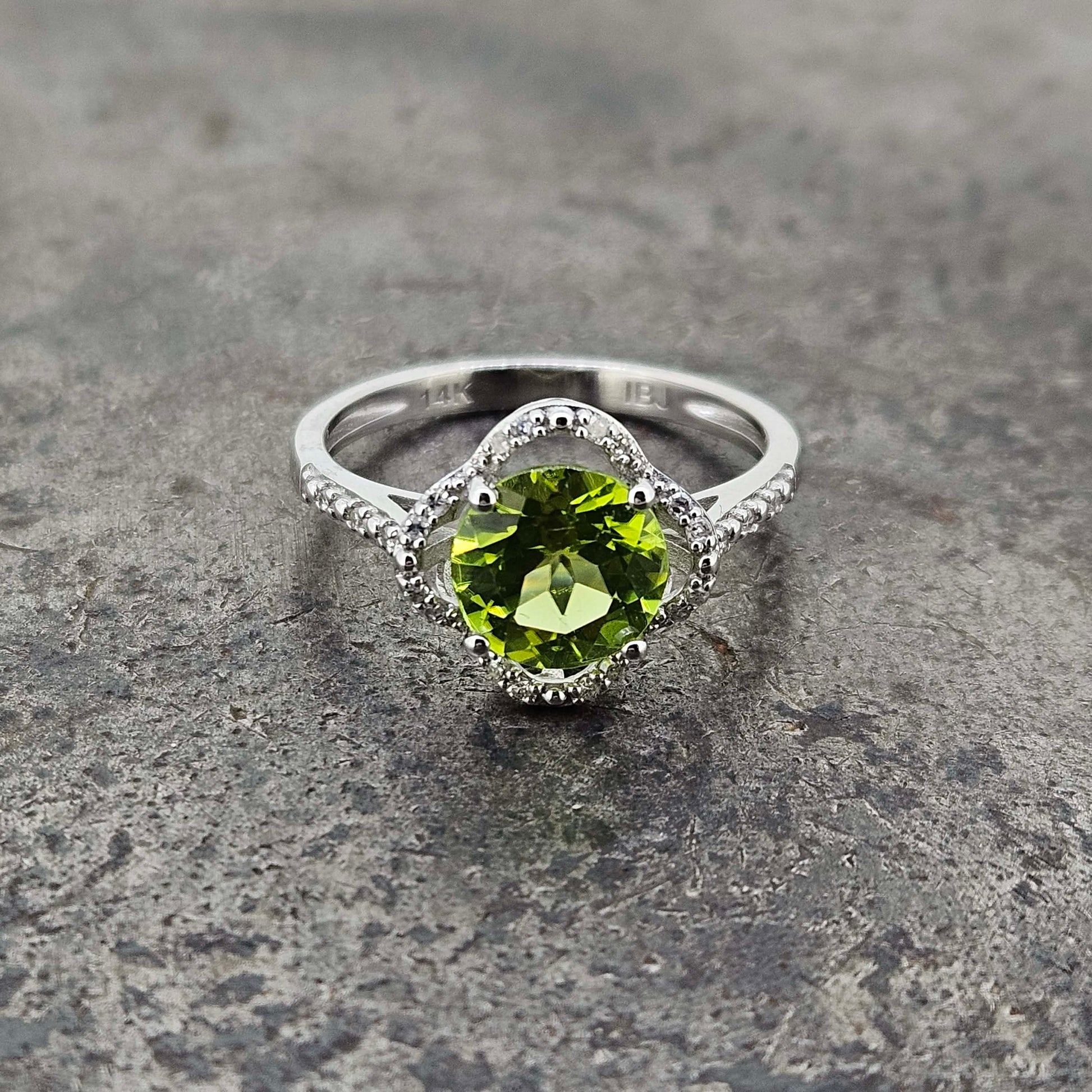This elegant 14k white gold ring showcases a peridot that is complemented by 0.10 carats of sparkling diamonds. The sophisticated design balances the stone's distinctive lime-green hue with the brilliance of white gold and diamond accents. Sized at 7, this ring combines timeless craftsmanship with contemporary elegance.