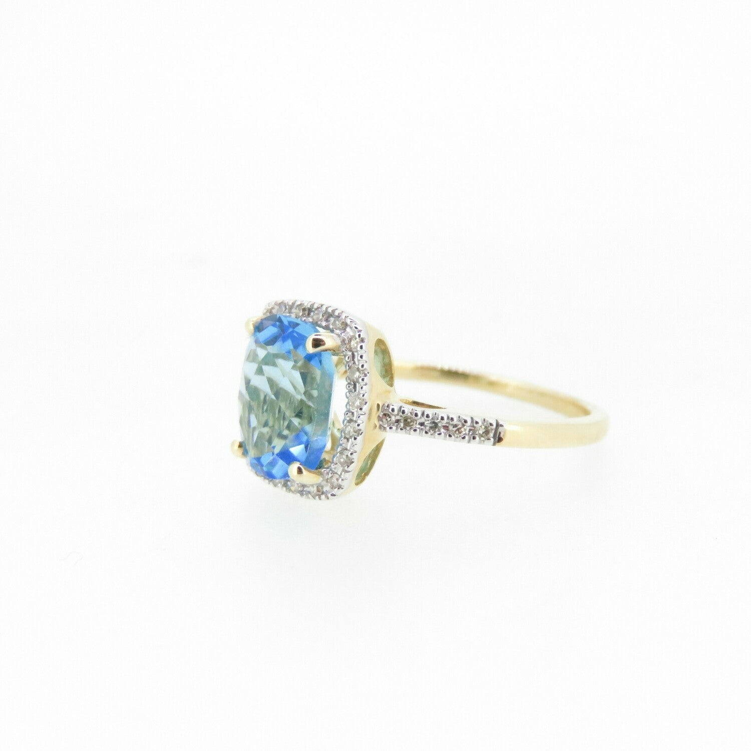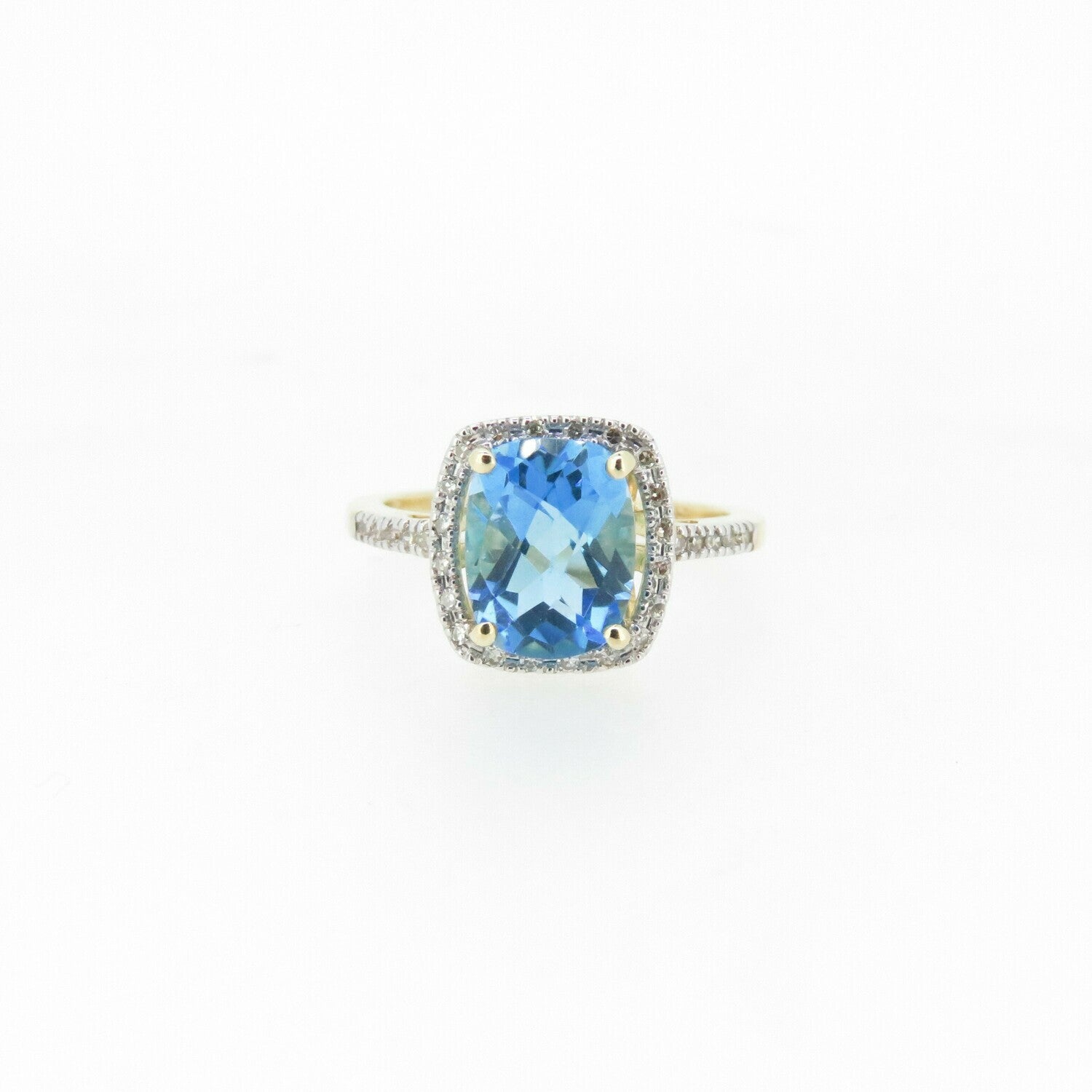 14k yellow gold 9x7 blue topaz and diamond ring. The total carat weight of the diamonds is 0.12cts.