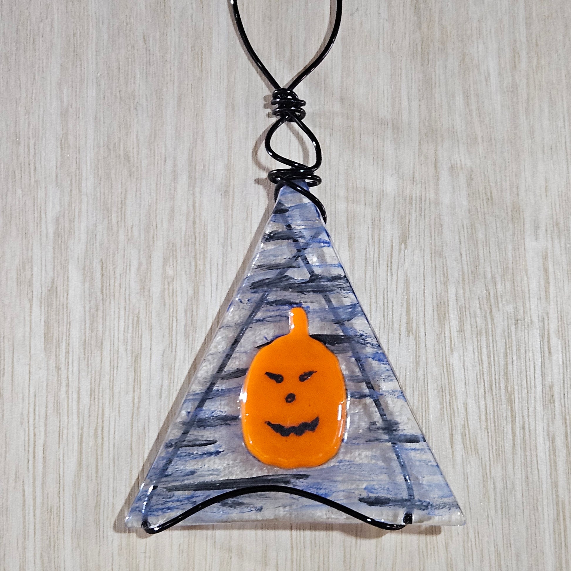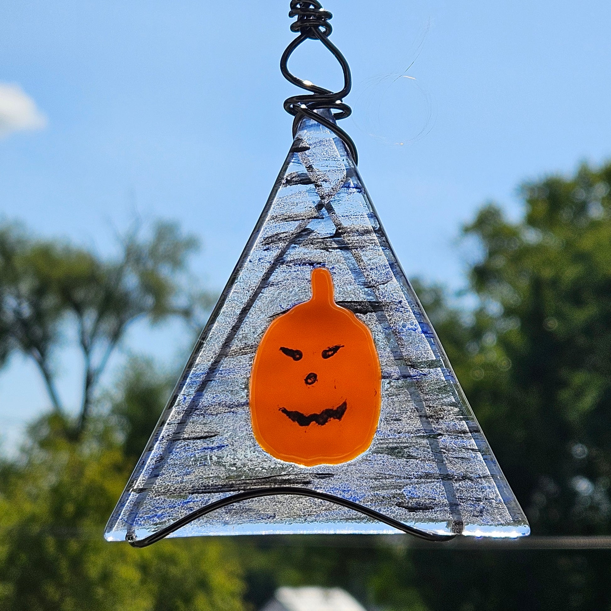 Create a captivating glow in any room with this handcrafted fused glass pumpkin suncatcher. Carefully wrapped in with black wire, that captures the light perfectly. A unique and enchanting decoration that brings personality to your home or office. The piece is about 3.25" in width and 6.25" in length including the wire.