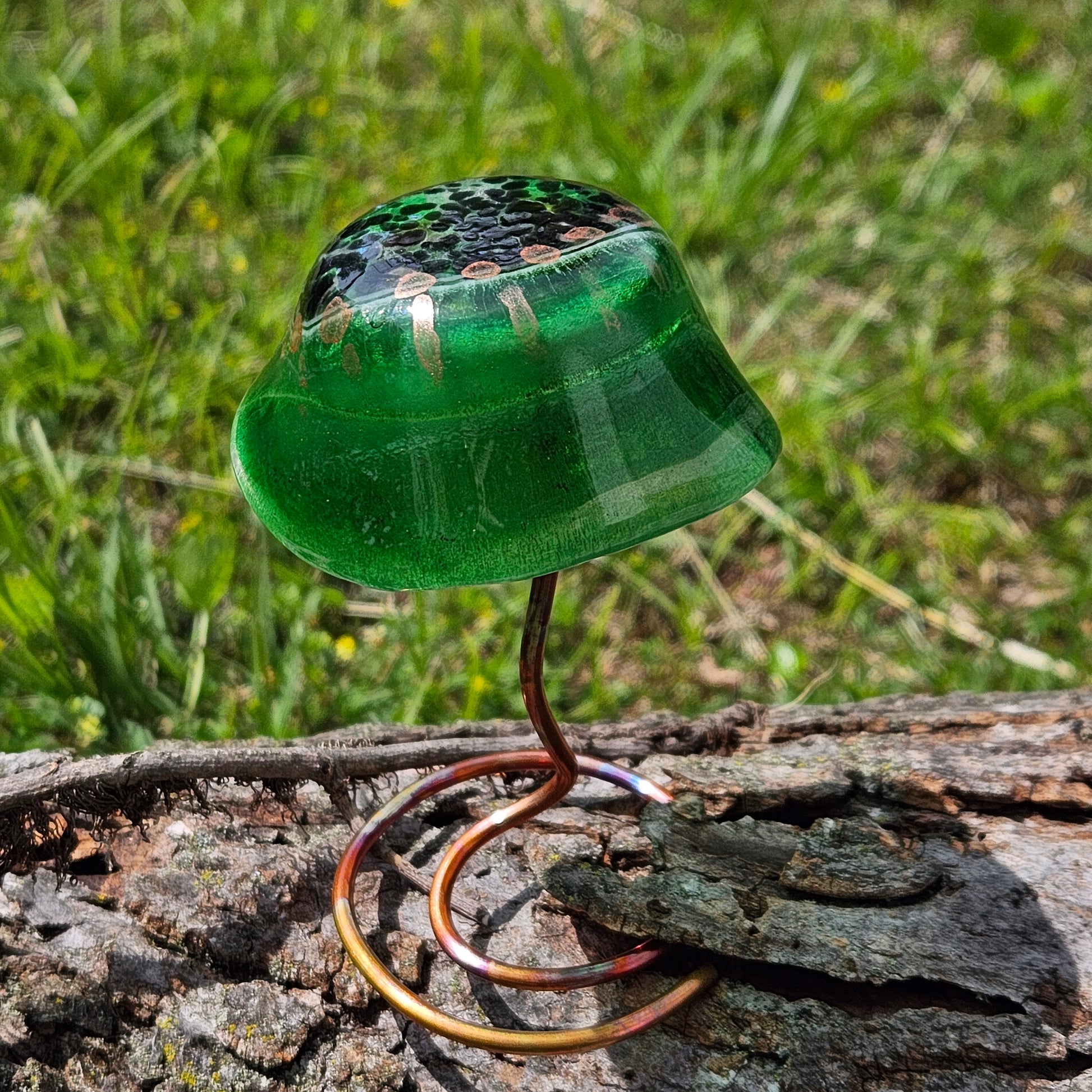 Handmade Fused glass slumped into mushrooms, the fused glass stands on copper wire. Perfect gift for foragers and mushroom lovers!