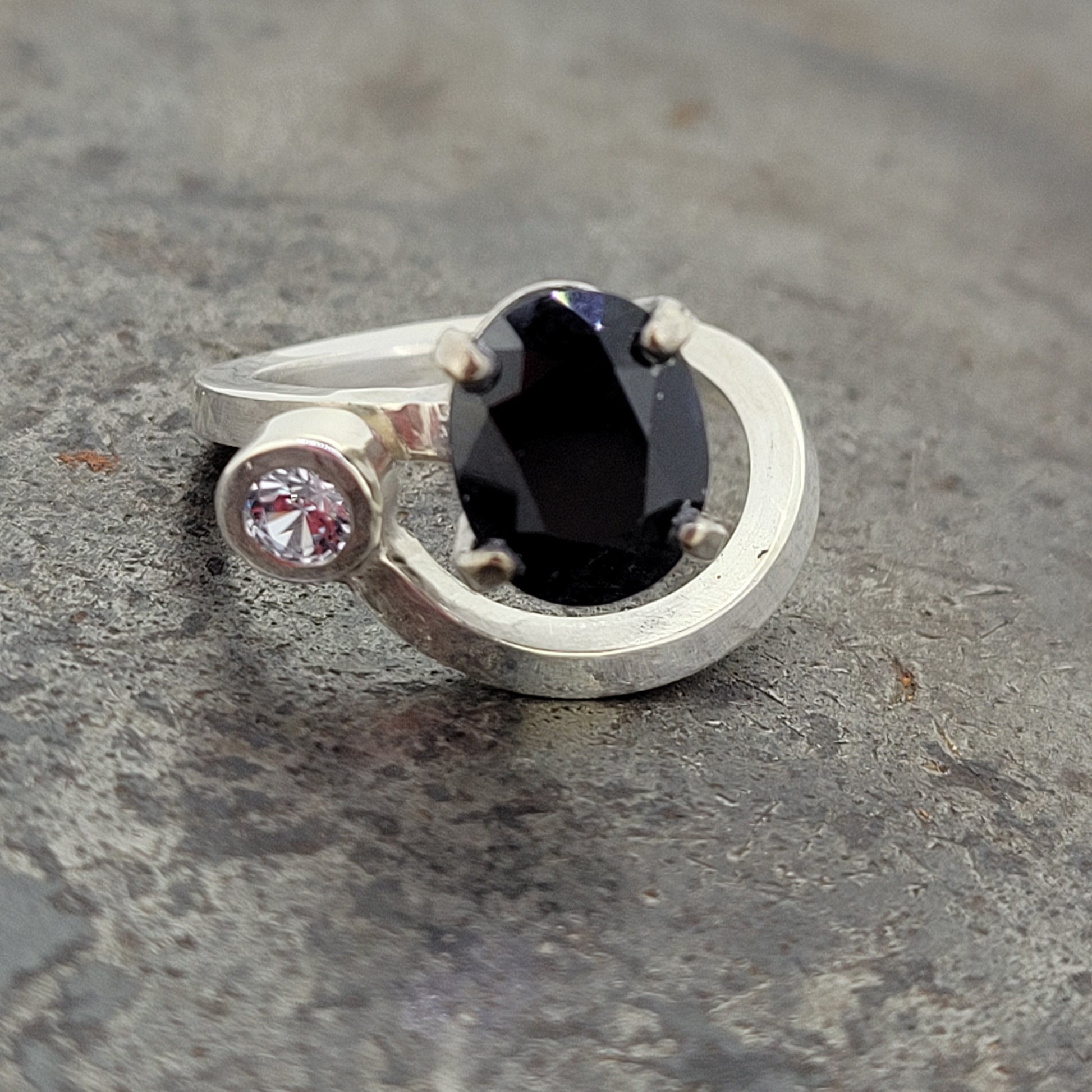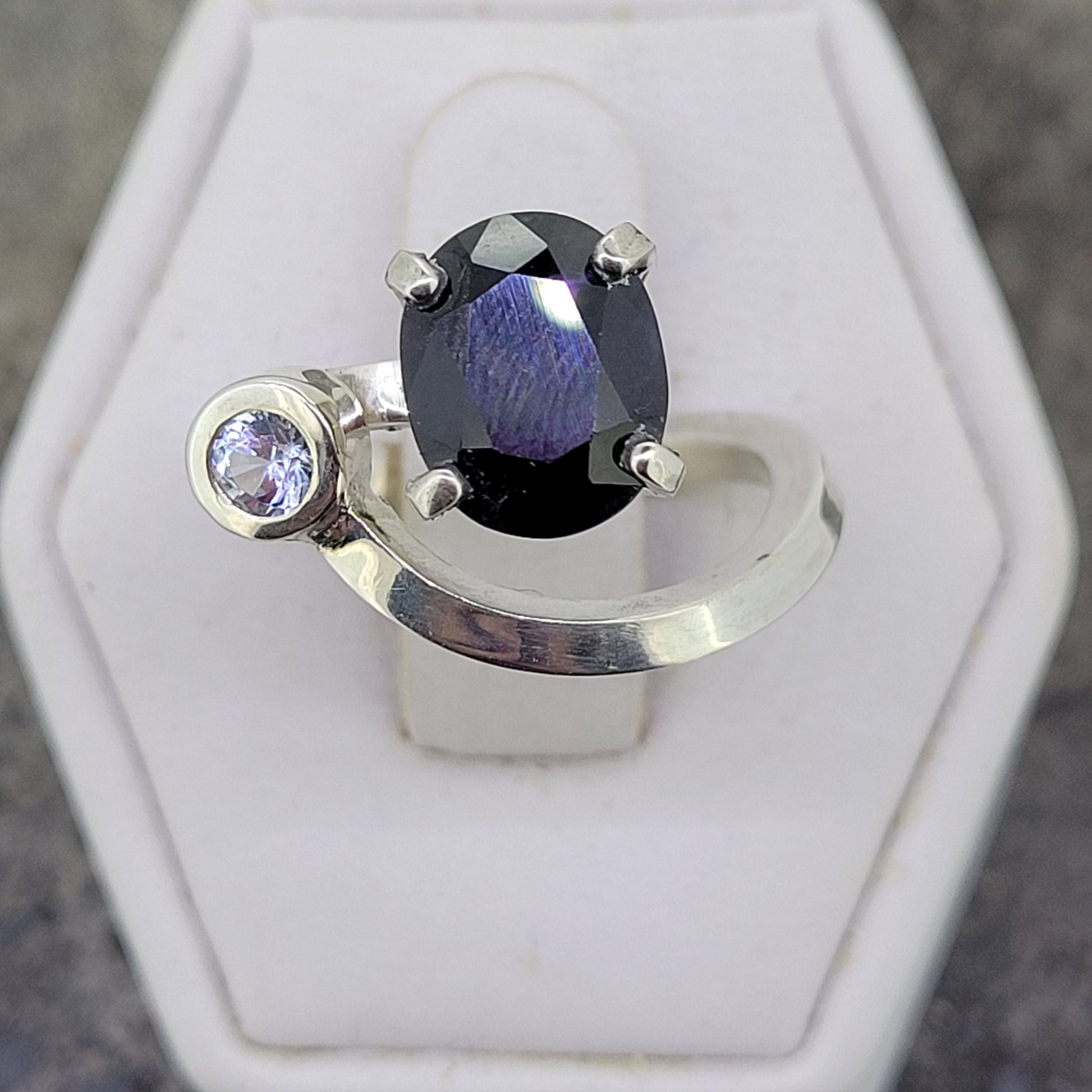 Sterling silver handmade and one of a kind ring with a 8x10 black/blue sapphire and a bezel set 4mm blue topaz. Finger size 7
