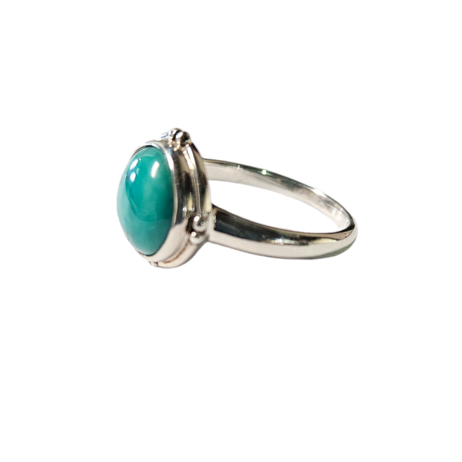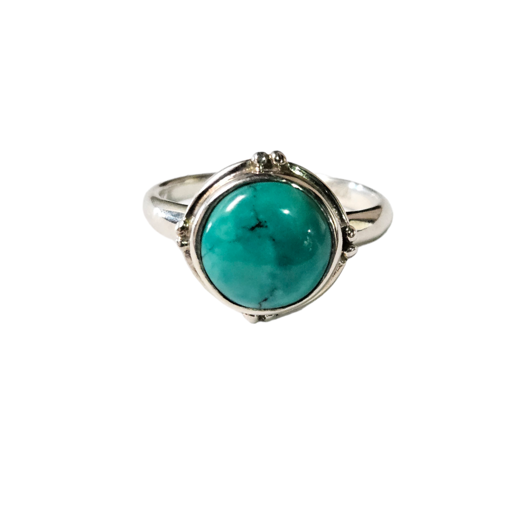 Expertly crafted with sterling silver and a vibrant turquoise stone, this ring is a timeless and sophisticated addition to any jewelry collection. The beautiful combination of materials creates a unique and eye-catching piece that will elevate any outfit. Available in size 8.
