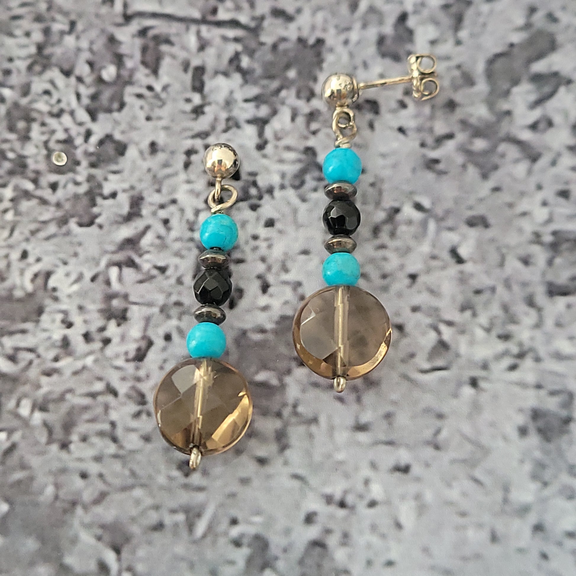 Sterling Silver, smokey quartz, turquoise and black onyx earrings